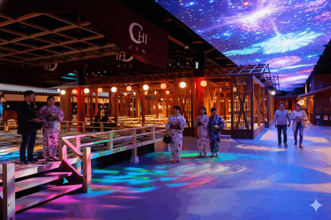 豪華なロビーを抜けると広がるのは、古き良き日本のノスタルジーと最新テクノロジーが融合した空間「東京小町」。この町並みの上、広大な天井一面に映し出されるプロジェクションマッピングは、訪れる人々をまず驚かせます。