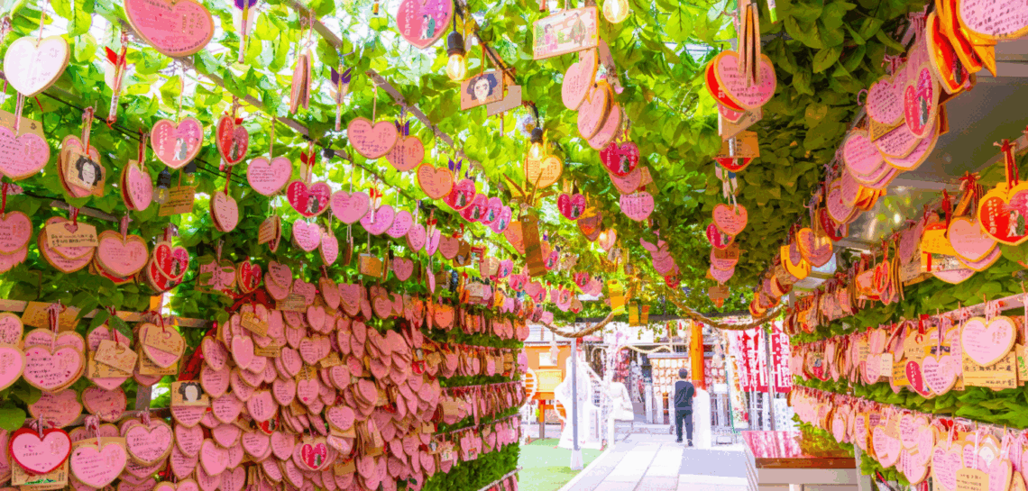 • ハート型の絵馬:恋愛成就を願う参拝者の思いが詰まったピンクの絵馬が並ぶ「えんむすびの絵馬掛所